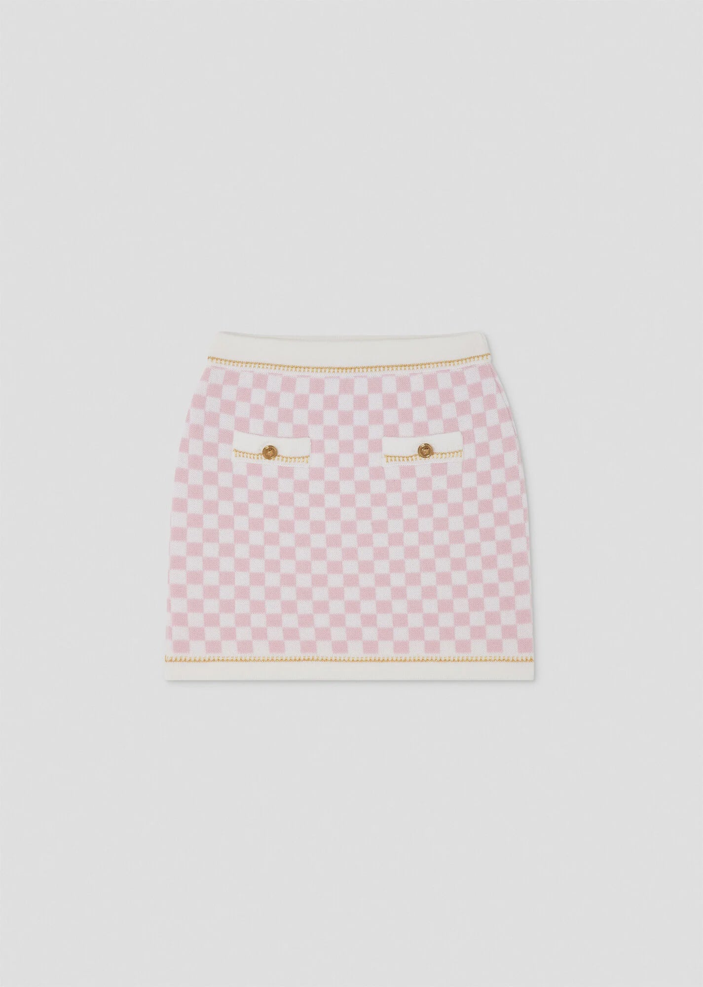 Knit wool-blend skirt featuring check pattern in white and pink. Metallic trim in gold-tone woven throughout.
