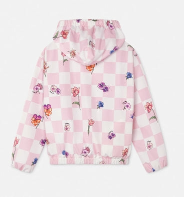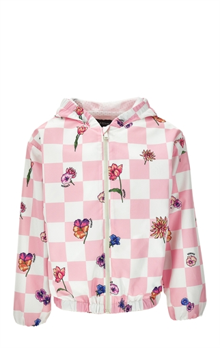 This waterproof hooded nylon jacket features a checkerboard pattern with whimsical flowers throughout and has a breathable mesh lining.