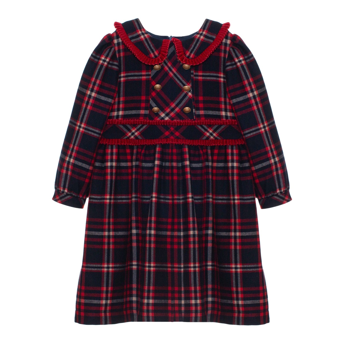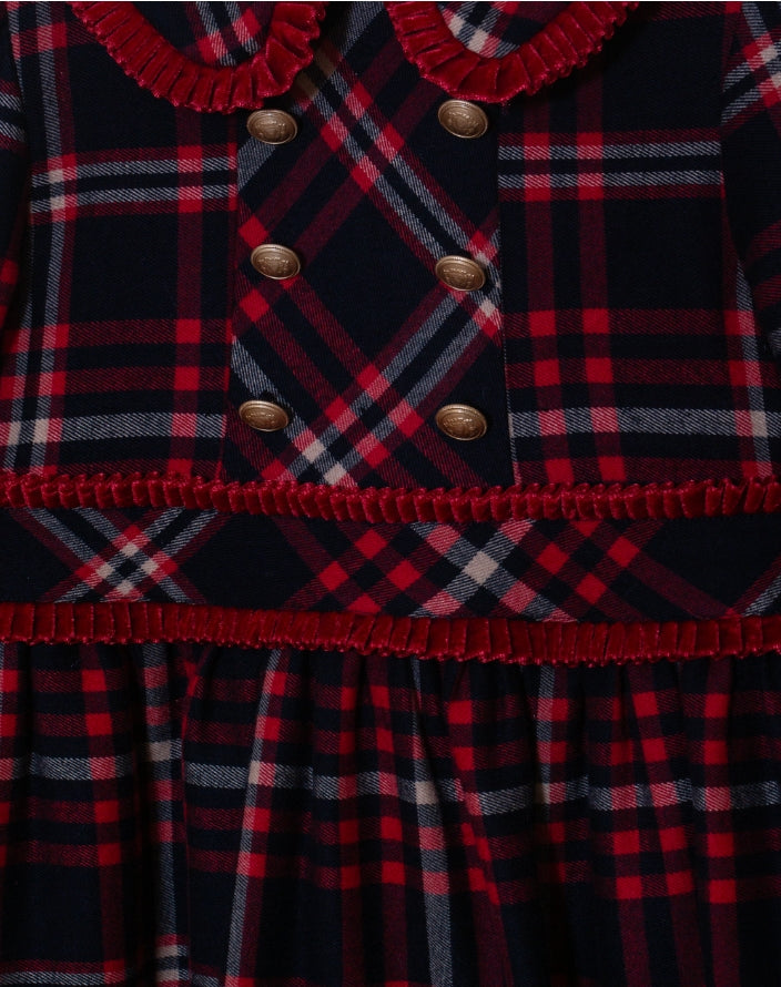 Embrace timeless style with our captivating Scottish Tartan Dress by Patachou, crafted from high-quality fabric with a classic tartan pattern. The double-breasted design adds a touch of formality, while the gold buttons on the chest elevate the look and create a hint of luxury. Perfect for special occasions, winter festivities, or adding a touch of elegance to any outfit, this dress is a treasured addition to any wardrobe.