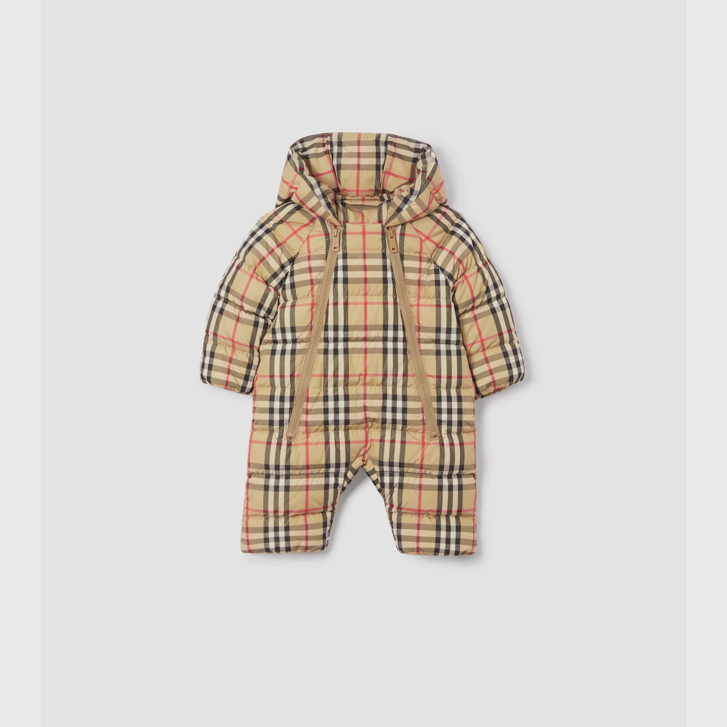 A hooded puffer suit in Burberry Check with a double zip closure.