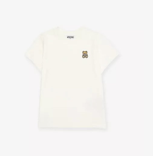 Moschino cotton-jersey T-shirt. Relaxed fit, ribbed crew neck, short sleeves, bear patch at front, brand tab at side.