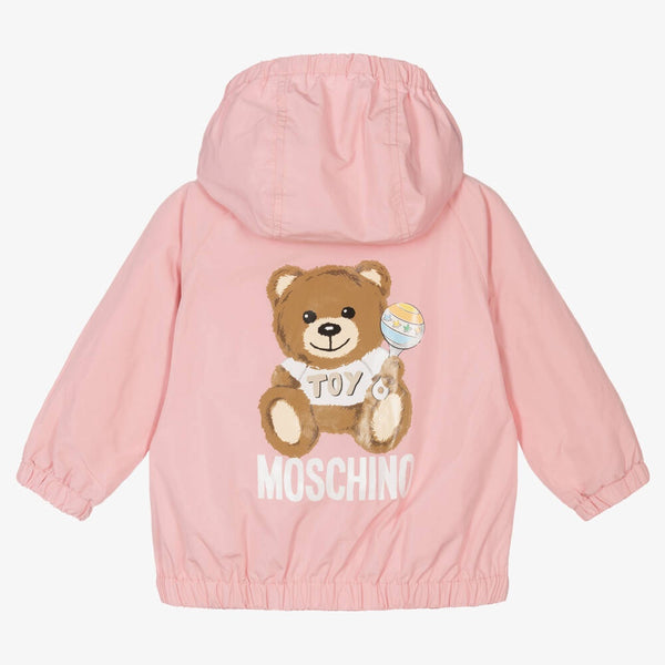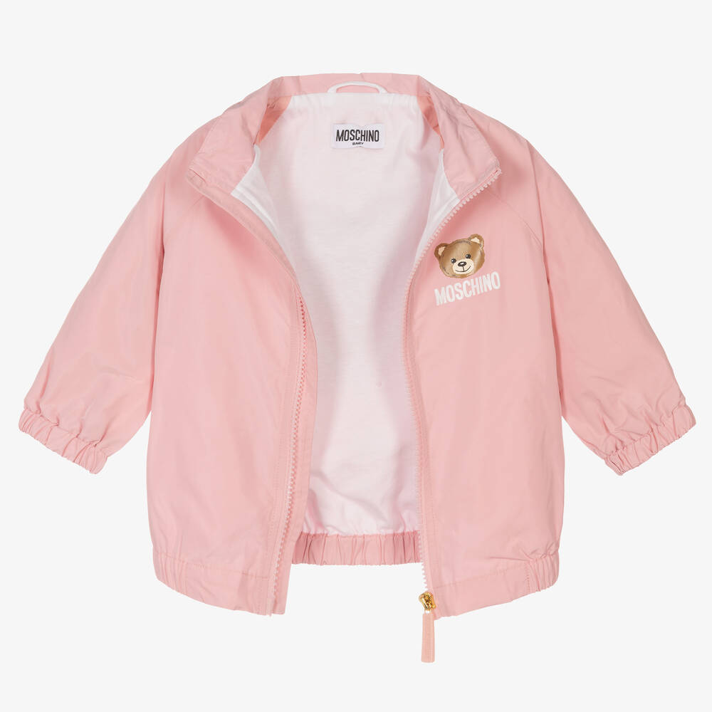 Lovely light pink jacket for little girls by Italian designer Moschino Baby, featuring the brand's signature Teddy Bear logo on both sides. Soft and smooth with a jersey lining, it has a zip fastening, front pockets and elasticated hems. There is a detachable hood with useful popper fastenings for a versatile style.