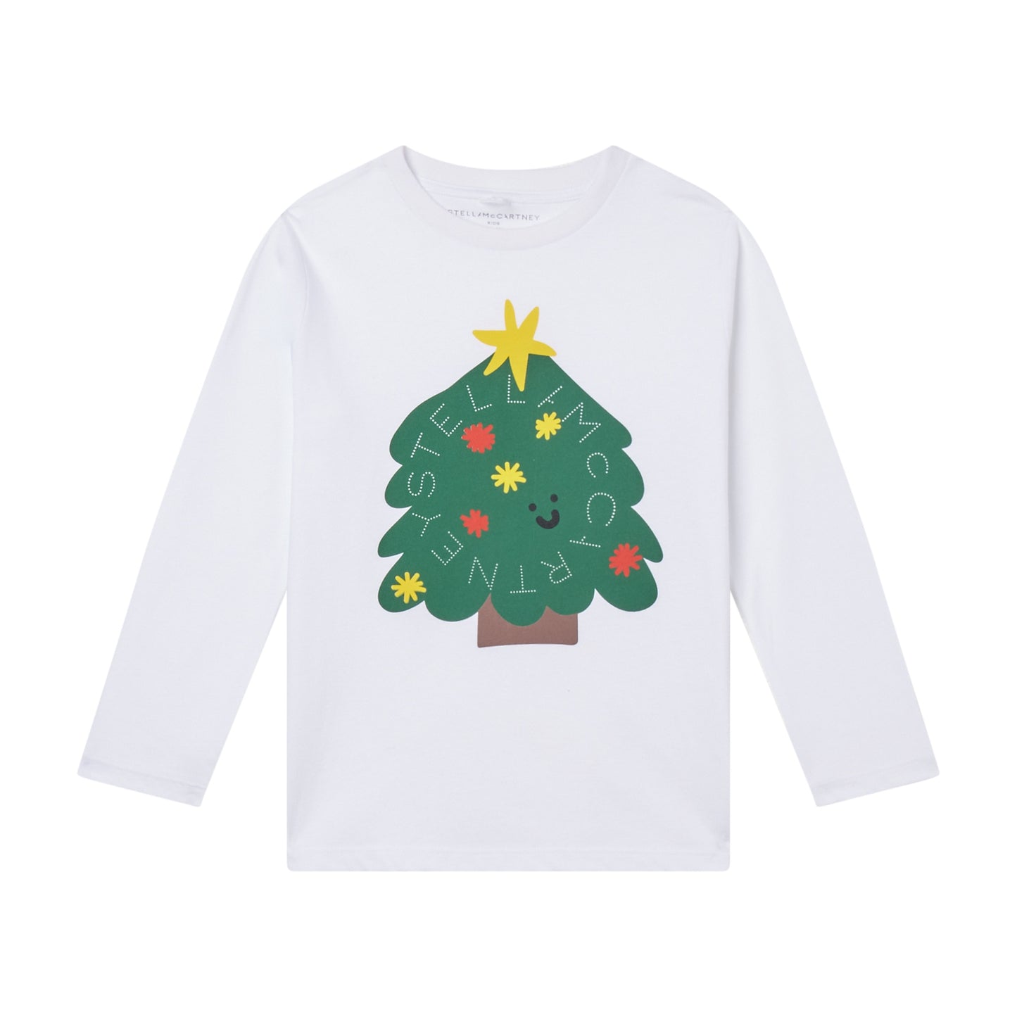 White long-sleeved top for boys and girls by Stella McCartney Kids, made in soft and stretchy organic cotton jersey. Casual and comfortable, it has a fun Christmas tree printed on the front with a bright yellow star on the top. The Stella McCartney fit can be quite small so choose a size up if you want room to grow.